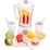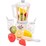 Prepare a delicious drink using a wooden blender with detachable base and rotating dial. Blender features a sturdy handle and removable lid, with a ring of stabilising bars. Also includes 2 wooden cups with removable pretend straws, 5 fruits with cutting segments joined by embedded hoop & loop buttons, a cutting board and play knife. Featured fruits include kiwifruit, banana, apple, orange and strawberry.
