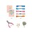 5 cotton skeins, 4 charms, 1 pair of pliers, 1 clip and 2 clasps, 1 explanatory booklet, 2 organza bags and 2 illustrated cards.