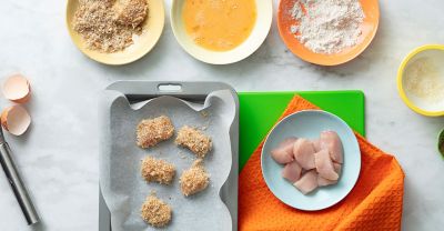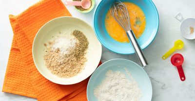 To make easy and healthier chicken nuggets, a homemade crumb is the way to go. Kids can portion the ingredients into bowls, and have fun whisking eggs!