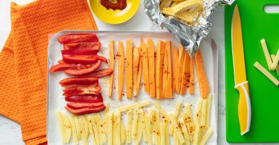 To make your rainbow chips, you’ve got to have colourful vegetables such as sweet potato and red capsicum. Adults can chop while kids can season the chips to taste delicious!