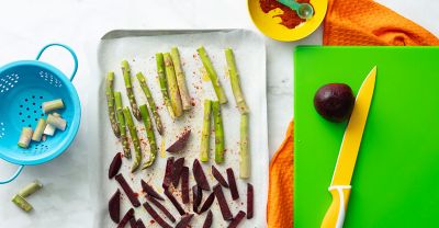 Don’t forget the final colours of the rainbow! Adults chop veggies such as pre-cooked beetroot, and asparagus, with kids adding the flavourful seasoning again.