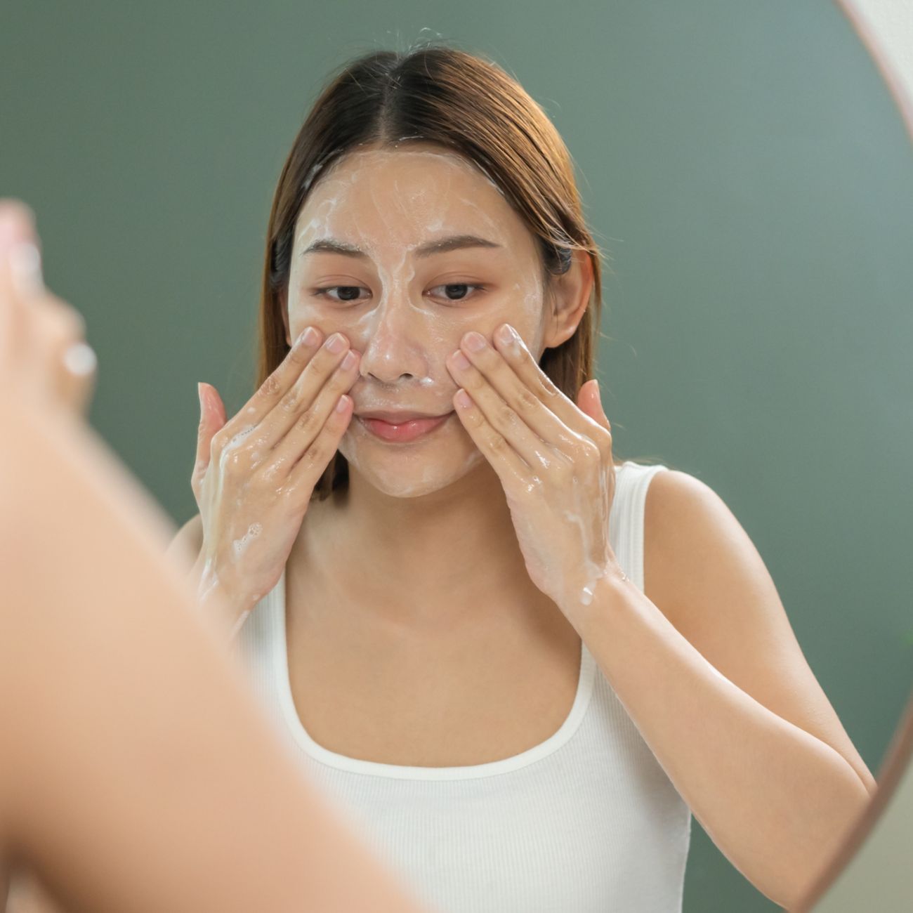 Apply cleanser to your fingertips and gently massage it onto your face in circular motions.