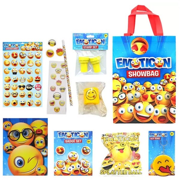 The Emoticon Mini Showbag includes a Mini Notebook Set, Sticker Sheet, Stamp, Badges, Splat Ball, Stationery Set, Keychain and Mini Slinky. It all comes packed inside a handy, non-woven Emoticon Mini Tote Bag.