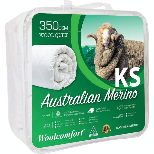 Australian Made 350GSM Merino Wool Quilt is a Medium-weight quilt with superior insulation, non-allergenic properties and softness make it ideal for crafting the finest premium quilts. It filled with 350 grams per square metre (GSM) 100 percent pure new Australian Merino Wool. We have taken the finest Australian Merino wool and encased it in our natural cotton fabric to create a superior quilt. Also, it is fire-resistant, free from harsh chemicals and breathable, contributing to a comfortable and restful night's sleep.