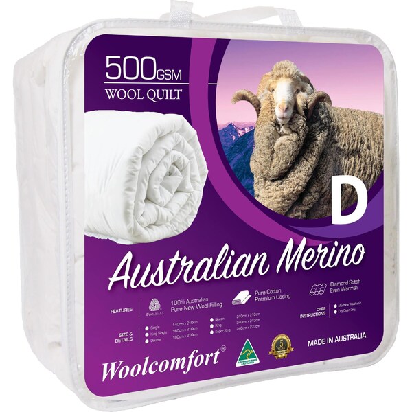 Australian Made 500GSM Merino Wool Quilt is a Medium-weight quilt with superior insulation, non-allergenic properties and softness make it ideal for crafting the finest premium quilts. It filled with 500 grams per square metre (GSM) 100 percent pure new Australian Merino Wool. We have taken the finest Australian Merino wool and encased it in our natural cotton fabric to create a superior quilt. Also, it is fire-resistant, free from harsh chemicals and breathable, contributing to a comfortable and restful night's sleep.