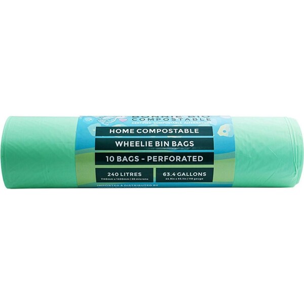 Each roll comes with 10 durable home compostable bags that are perforated for easy tearing. Each bag has a 240L volume capacity.