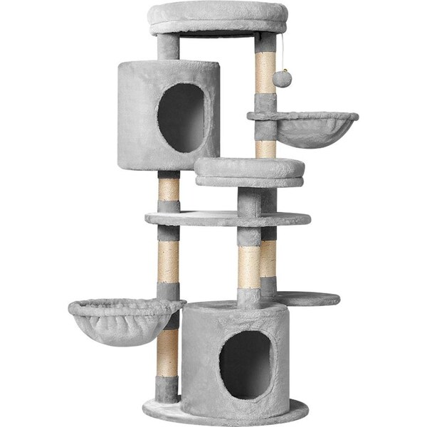 A purrfect way to keep your cats entertained! Our i.Pet Cara medium-sized cat trees cater to your feline friend's scratching instinct and playtime and provide enough space to relax and nap. It's absolutely a feline wonderland. Our cat trees feature bed cubicles, side sleeping hammocks, cradle, and platforms for tom and tabby to have hours of fun scratching, hunting, climbing, jumping, hopping, and playing with favourites or simply lounging around. Additionally, with its sisal-covered scratching posts, you can rest assured that your furniture will stay scratch-free. It also has soft plush upholstered surfaces, ideal for napping after a long playtime. For your peace of mind, our cat trees boast a firm base and sturdy wood construction. This ensures good stability and durability. With so many playing and napping spots, our Cara cat tree is just right for your cat to have its energetic exploration.