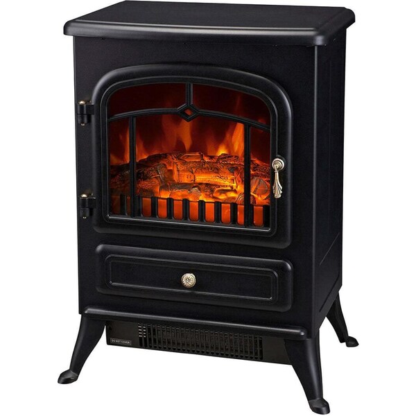 • Electric Fireplace Heater, 2 heat settings, overheat protection, tip-over switch, secured glass, real flame effect, flame effect on without any heat setting, adjustable flame brightness, free-standing heater, swing open door to access ‘fire logs', pull-down drawer to access control panel, black cold rolled steel finish