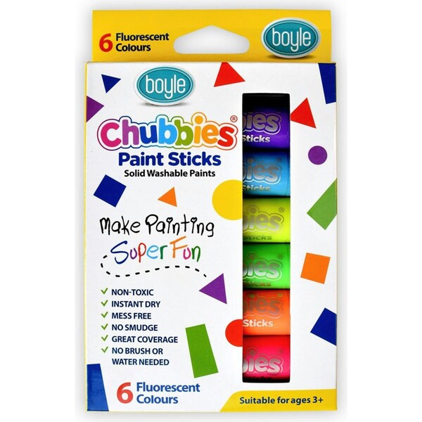 Each pack contains 6 x 10g washable solid paint sticks in assorted colours.