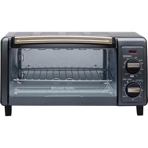 The Russell Hobbs Compact Air Fry Toaster Oven in gunmetal grey with premium gold accents boosts five cooking functions so you can bake, grill, toast, air fry and keep warm. It features air fry technology for crispy results and natural convection for more even and efficient cooking. With generous capacity in a small footprint, it fits a 9” pizza or 4 slices of bread.