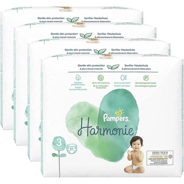The Pampers 124 Pack Harmonie Hypoallergenic Unisex Baby Nappies Diapers Size 3, 6-10kg has been crafted from premium cotton and soft plant-based fibres that are gentle on your baby's skin. Perfume and lotion-free, these nappies also offer up to 12 hours of dryness for the best in comfort.