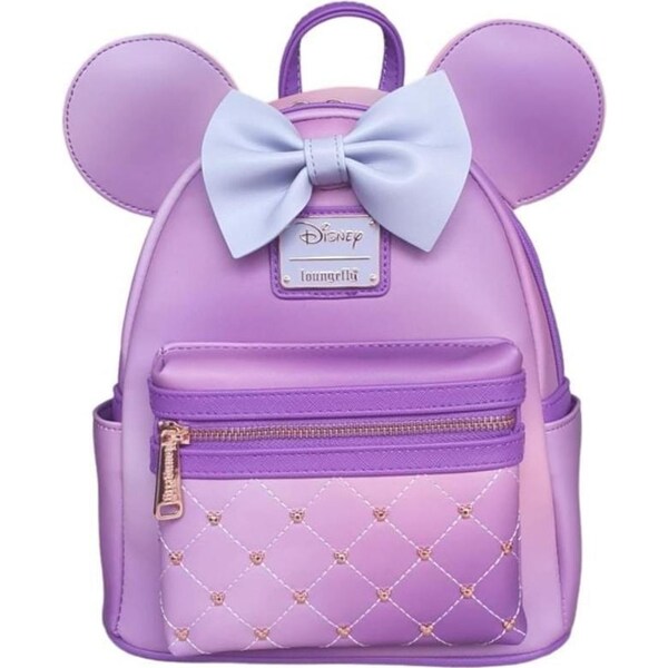 This purple vegan-friendly leather bag takes inspiration from the one and only Minnie Mouse. With her signature bow, ears, rose gold mouse studs on the front pocket and matching hardware, this simple and sylish design is perfect for fans of Disney's leading lady. In addition to a roomy main storage compartment with themed lining, this mini backpack features a top carry handle, adjustable shoulder straps, two side pockets and a front zipped compartment.