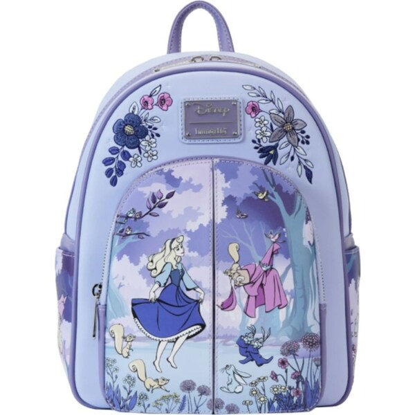 Embroidered flowers frame the front of this accessory, where Aurora dances with her woodland friends on the bag's front zipper pocket. Watch the scene unfold by opening the magnetic flaps on top of the pocket, revealing Prince Phillip and Aurora as they share a dance. Turn the bag around to see Aurora dressed in a hat and cloak on one side pocket as Prince Philip watches her on the other. On the back, Flora, Fauna, and Merryweather appear near a quote from Aurora's storybook. This mini backpack makes a spellbinding addition to any outfit and is perfect for fans looking to keep their favorite characters close.