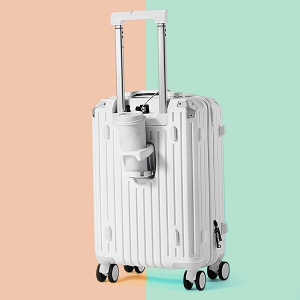 Tabibito luggage suit case with modern multifunction design and premium quality construction, made of high quality PVC surface. Also come with TSA-Approal lock. Collapsible water cup holder can convenient get the cup while you drinking. And equip USB charge port, charge your phone and other in any time. Unique side hook design make you can hang small thing, free your hands.And with smooth and lockable spinner wheels. The Classic organization designs which has the zipped compartments-a mesh compartment, a waterproof compartment and a strap to fix your cloth. Easy organize and storage more things. It's convenient to carry or manoeuvre around airports, train stations or any transport hub. Enjoy your journey with Tabibito luggage suit case.
