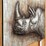 This artwork features the head of a rhinoceros as its central focus, meticulously handcrafted from metal to achieve a lifelike 3D effect. The metallic rhinoceros, with its intricately detailed features, is mounted on a base and frame made of Pallet Wood, securely fixed with small screws. The rustic charm of the Pallet Wood beautifully complements the metallic sheen of the rhinoceros, creating a striking contrast that's both visually engaging and thought-provoking.