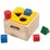 The Plan Toys Shape and Sort It Out wooden toy set include two pieces of each shape (red pyramid, blue cube, green cylinder). A wooden box is also included in this set with a removable yellow lid for storage.