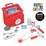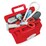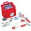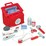 A vintage style, child sized, fabric Doctor's Bag filled with wooden medical instruments and bottles. The set includes a toy stethoscope, thermometer, syringe, blood pressure gauge, ear scope, reflex hammer, scissors and two medicine bottles.