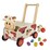 A sturdy wooden ride-on walker with shape sorting side panels and six shape sorting blocks.