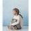 Figure of seated girl with darker skin tone and hair color, in cream shirt and blue jeans, with arms wrapped around knees
