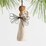 This hanging ornament features an angel in a cream dress with wire wings, holding the words 'thank you' written in wire inside a wire circle. Hook and loop affixed to figure's head. Sentiment is written on hangtag.