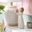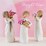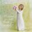This piece features a standing figure in a cream dress, holding out a small bouquet of pink peonies.
