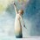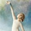 This piece features a standing figure in a cream dress embellished with blue ombré and gold-leaf dots at the base. The figure is looking up, with one arm extended upward.