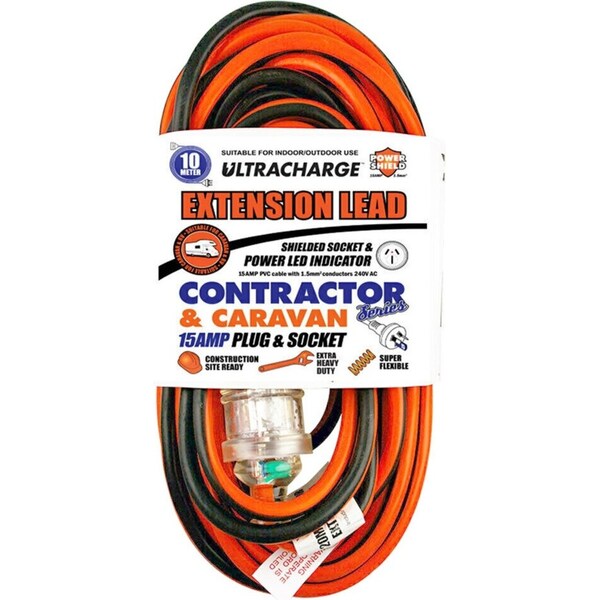 The Ultracharge Contractor/Caravan Suitability Lead 10m 15A This heavy duty mains 10m extension lead features a 15A plug and socket used for 15 amp connections.