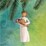 - Figure in cream dress, holding large bouquet of purple tulips.