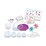 2 Unicorns figurines, 1 coloured sticker, 2 white crystal compounds, 3 colourants, 1 white seeding compound, 1 stirring bowl & spoon, transparent growing cups (1 large, 1 medium & 2 small), 1 terrarium tray with cover, ring-shape templates and detailed instructions.