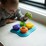 Press the button under the orange lid to hear it squeak. Open up the purple lid to find a textured spinner, or feel the funny bumps under the green lid.