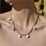 Please kindly note that the position of the pearl necklace sitting on your chest can vary from individual to individual depending on your top size. Model is a size 8.