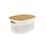 This is a white plastic oval basket with a bamboo lid. It measures 24 cm in length, 18 cm in width, and 12 cm in height. It is perfect for storing items around the home and adding a decorative touch.