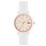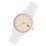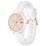 Powered by Quartz movement, the stunning Lacoste watch features a 38 mm case, 10.75 mm case thickness, and a 17 mm band width. Crafted from mineral crystal and encased in stunning carnation gold, the watch secures with a tongue buckle white silicone strap that offers a 5 ATM water resistance.
