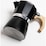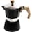 Matte black stove top coffee maker with a soft touch wood look handle.
