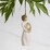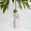 This hanging ornament features a figure in a cream dress, holding a pierced gold-leaf wreath of hearts. 2024 laser-etched in wreath. Hook and loop affixed to figure's head.