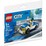 The set consists of 37 pieces which are used to make a minifigure, handcuff accessory, and small car. The car is built with a black chassis and four wheels attached to the sides. There are two 1 x 3 Bright Blue plates on the side of the top of the chassis. The middle is left empty for sitting space for the minifigure. On top of the plates are two 1 x 3 x 1 White walls facing inwards. On top of the wheel chassis is four 2 x 4 White mudguards. The mudguards in the back have a Transparent Blue 1 x 2 tile on top of them. There is a Bright Blue angle plate on the front of the car, with a Bright Blue bow with tile on top and various pieces making a bumper in front. Two 1 x 1 Transparent Yellow tiles form headlights.
