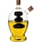 Two compartments and spouts separate oil and vinegar.