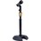 The HERCULES MS100B PLUS Round Base Tabletop Microphone Stand with EZ Grip Height Adjustment, a heavy-duty "H" base, and an EZ Microphone Clip. It has remarkable stability and a space-efficient design. This platform is ideal for tabletop installations, kick drum live capture and recording, and other low-profile applications.
