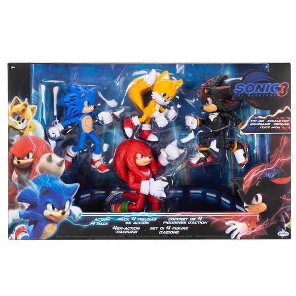 From the Sonic the Hedgehog 3 movie, this 5” scale figure 4-pack includes Tails, Sonic, Knuckles, and Shadow! These deluxe articulated figures with movie-authentic details are perfect for dynamic action poses to recreate your favorite movie scenes. Sonic and Shadow come with a light-up feature that illuminates their eyes and quills to really bring the action to life! Ages 3 +