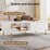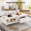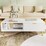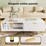 This modern white coffee table brings an elegant touch to any living space. Crafted with a smooth wooden board and accented with gold metal handles and legs, it exudes a luxurious yet versatile charm. One side features a spacious drawer with a fluted design, perfect for storing essentials, while the other half offers an open shelf for easy access to decorative items or books. The table is thoughtfully designed with rubber feet mats to protect your floors from scratches. Its clean, sleek lines make it a perfect addition to any contemporary home.