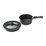 The 28cm deep-dish frypan and a 24cm extra-deep saucepan, both of which feature a water-based non-stick coating. The silicon-ringed, interchangeable see-through lid suits both the frypan and the saucepan without changing anything.