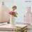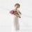 This piece features a standing figure in a cream dress holding a large bouquet of bright pink tulips.