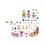 Set includes 1 girl, 2 women, 1 mouse, 2 different colored kittens walking, 1 kitten sitting, 1 cat lying down, 2 cats standing, 1 cat sitting, 1 counter, 1 shelf coffee maker, 1 box, 2 baskets, 1 blanket for basket, 1 large scratching post with swinging lounger, 1 shovel with small rake for cat litter, 4 cat litter boxes, 2 chairs, 1 table, 1 sign, 1 flower vase, 1 rose, 3 cat milk, 1 hair bow, 1 apron, 2 sandals, 1 tray, 1 coffee pot, 4 plates, 4 cups, 2 donuts, 2 muffins, 2 order slips, 1 pen, 1 ball of wool, 1 cat toy, 1 food bowl, 1 bucket, 1 cat fishing rod with mouse.