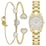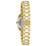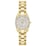 - A dazzling display of luxurious design, this Bulova ladies' box set includes a Crystal collection timepiece and two bracelets. The gold-tone stainless steel case of the timepiece features a tapering design that curves effortlessly around the wrist, with brushed finishing and polished accents, and is embellished with 48 crystals. The mother-of-pearl dial features gold accents, 8 sparkling crystal hour markers, and a pave center formed by 102 meticulously set crystals. The timepiece is completed with a matching gold-tone stainless steel bracelet with a deployant buckle. Complementing the timepiece are two bracelets: a refined gold-tone memory bangle featuring mother-of-pearl hearts bordered with 36 crystals, and a contemporary gold-tone bolo chain bracelet that alternates with small mother-of-pearl hearts and larger pave crystal hearts, totaling 38 crystals. As versatile as it is stylish, this Bulova ladies box set can be worn all at once or separately, perfect for accompanying you day to day.