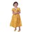 Satin dress in yellow and gold tones with shimmery tulle peplum at the waist and 3D foam filled red rose embellishment