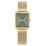 This elegant women's watch features a precise quartz movement housed in a slim 21.3 mm case with a 6.6 mm thickness. The green dial is beautifully complemented by a thin gold steel case coated with ionic plating and adorned with crystals. Its 14 mm band, also ionic plated, secures comfortably with a sliding buckle. Crafted with mineral crystal and water-resistant up to 3 ATM, this timepiece combines style and durability for everyday wear.
