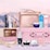 This exquisite metallic pink vanity unveils 12 luxurious essentials. Discover 7 full-size treasures and 5 travel-size favorites within this festive masterpiece. Elevate your beauty routine to new heights of Parisian elegance.